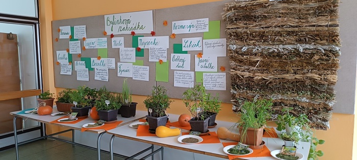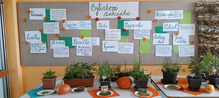 Náš školní vestibul je často využíván jako malá výstavní síň. První letošní výstavka má název Bylinková zahrádka. Můžete si zde prohlédnout a přivonět k nejrůznějšímu koření a bylinkám, které pomáhají léčit nebo jsou pomocníky v kuchyni našich maminek či babiček.