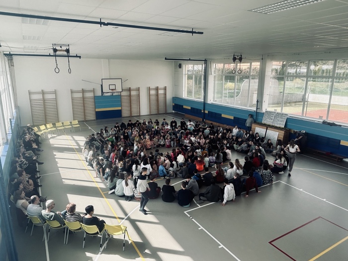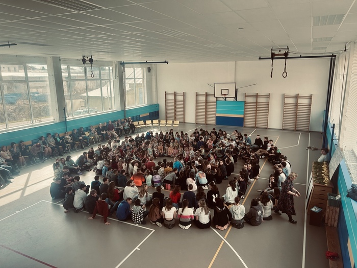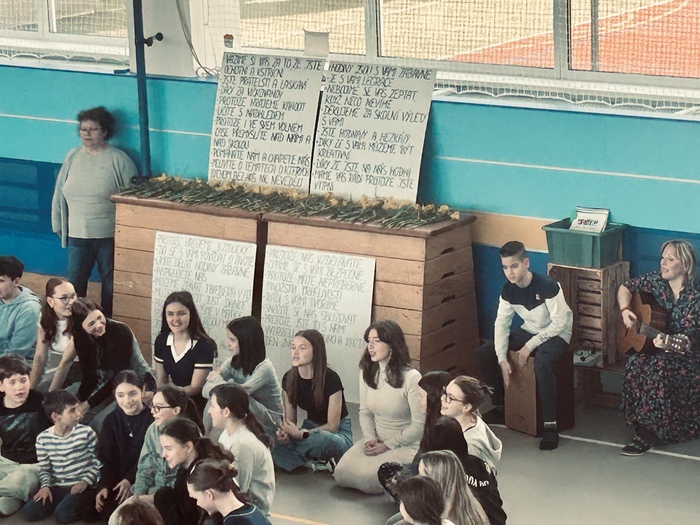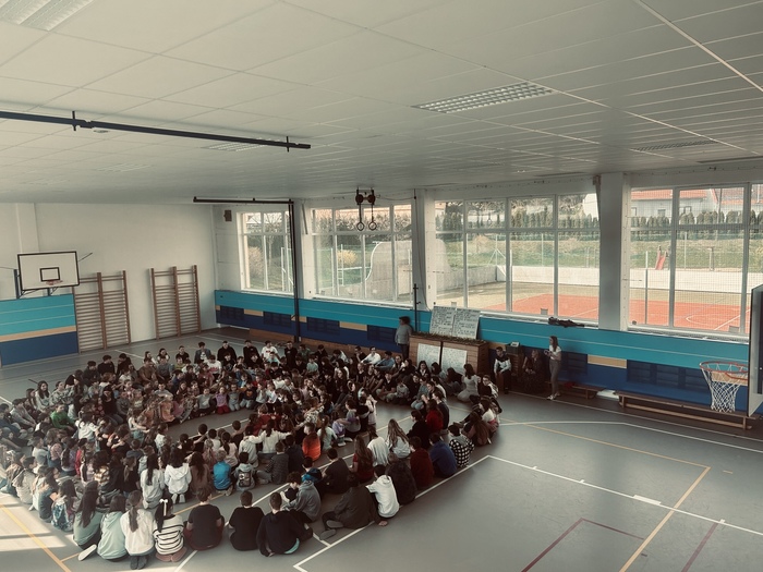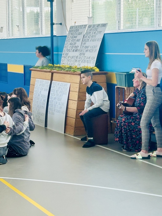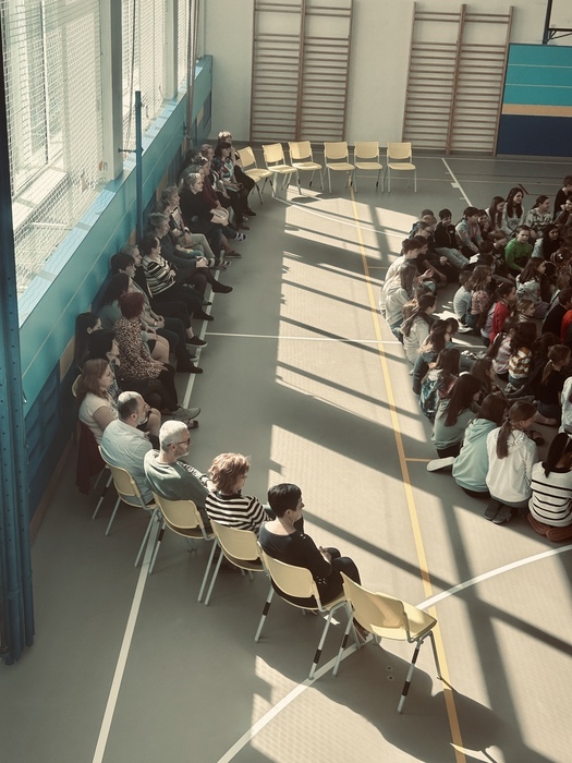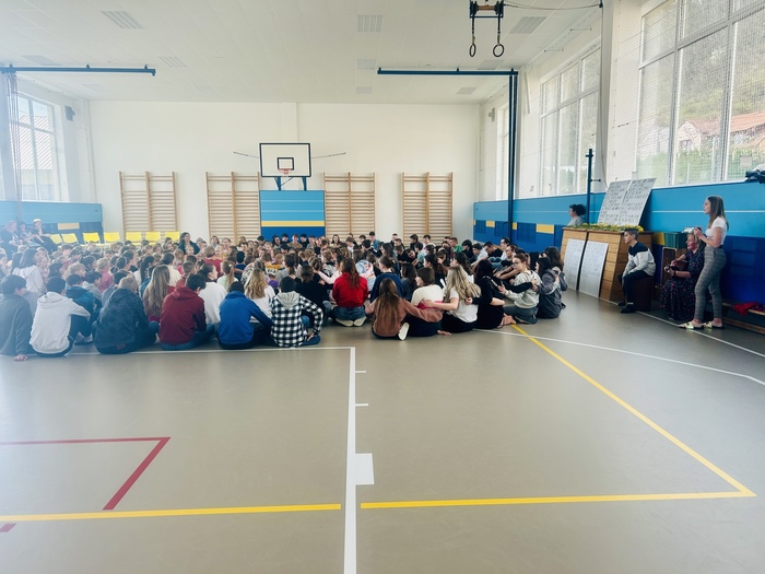 Letos jsme si Den učitelů připomněli o den dříve, tedy 27. března. Se všemi učiteli a žáky jsme se sešli ve velké tělocvičně, kde na učitele čekalo překvapení. Žáci celé školy se naučili bubnovat na své tělo Mozartův Turecký pochod, nácvik byl náročný, ale výsledek stál za to! Poté jsme si společně zazpívali písničky, deváťáci pronesli proslov a předali dárečky všem pedagogickým pracovníkům naší školy. Žáci vymysleli také důvody, proč mají své učitele rádi. Všechno bylo zapsáno na velkých plakátech a každý učitel je dostal do svého přáníčka, ať si je může v těžkých chvílích připomenout… Velké poděkování patří Žákovskému parlamentu a všem, kdo se na organizaci podíleli.