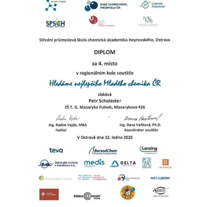 Ve středu 22. ledna proběhlo v prostorách VŠB-TU Ostrava slavnostní vyhlášení výsledků regionálního kola soutěže „Hledáme nejlepšího Mladého chemika ČR“. Naši školu v této soutěži úspěšně reprezentoval žák 9. B třídy Petr Scholaster, který se v rámci Moravskoslezského kraje umístil na krásném 4. místě. Petr musel během tří soutěžních kol prokázat své teoretické znalosti chemie i praktické dovednosti při práci v laboratoři. Odměnou za tuto soutěž mu byla exkurze do BorsodChem MCHZ Ostrava a slavnostní program s předáním cen od sponzorů z řad chemického průmyslu a vysokých škol našeho kraje. Největším oceněním a také výzvou je však pro Petra postup do celostátního finále této soutěže, které se bude konat 12. června v prostorách Fakulty chemicko-technologické Univerzity Pardubice. Petrovi k tomuto úspěchu blahopřejeme, ve finále mu budeme fandit a držet pěsti.