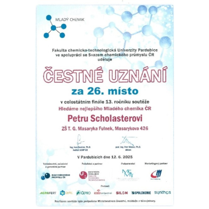 Žák naší školy Petr Scholaster úspěšně reprezentoval školu v celostátním finále prestižní soutěže „Hledáme nejlepšího Mladého chemika ČR“, v níž dosáhl fantastického úspěchu a v konkurenci 42 nejlepších mladých chemiků z celé republiky se umístil na krásném 26. místě!