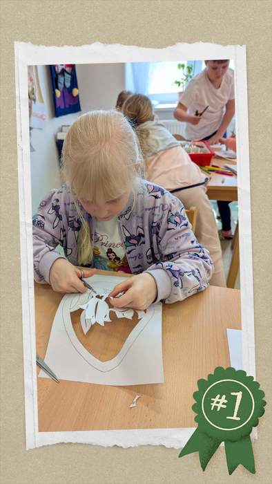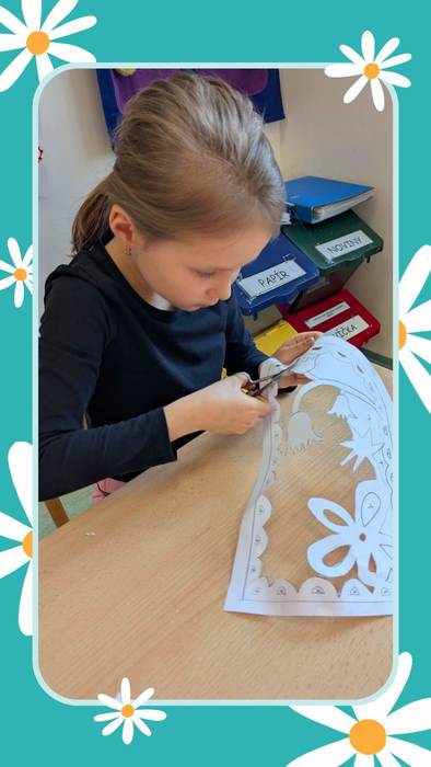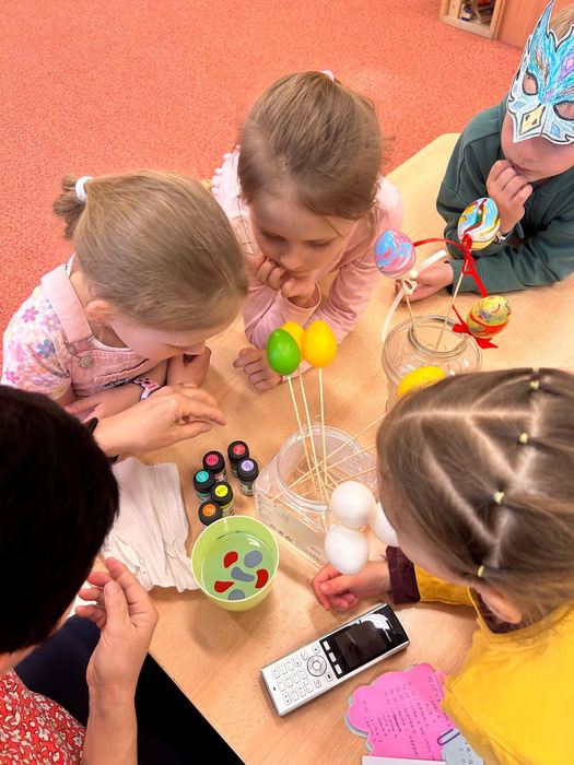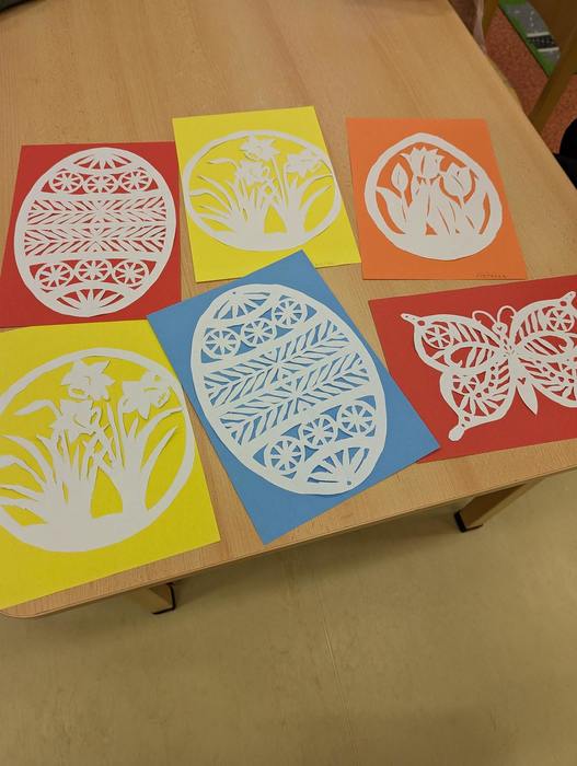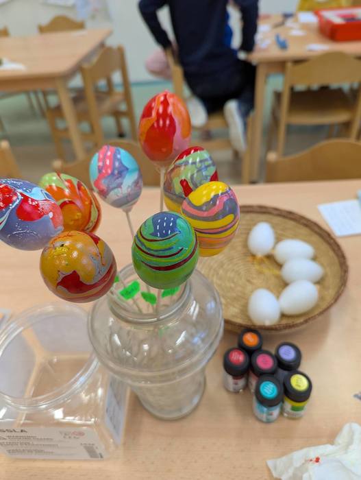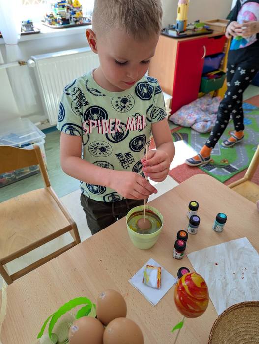 V družině si trpělivé děti vyzkoušely bílé velikonoční vystřihovánky a také novou techniku mramorování vajíček, která se nám moc líbila a sklidila veliký úspěch.