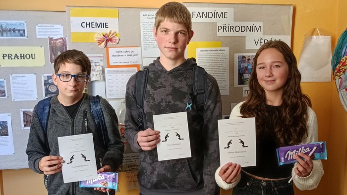 V soutěži Přírodovědný klokan si mohli v říjnu žáci 8. a 9. ročníků otestovat své znalosti přírodních věd. Nejlépe si s otázkami z oblasti biologie, fyziky, zeměpisu, matematiky i logiky poradili a nejlepšími školními „klokany“ se stali Petr, Sabina a Dominik. Blahopřejeme!