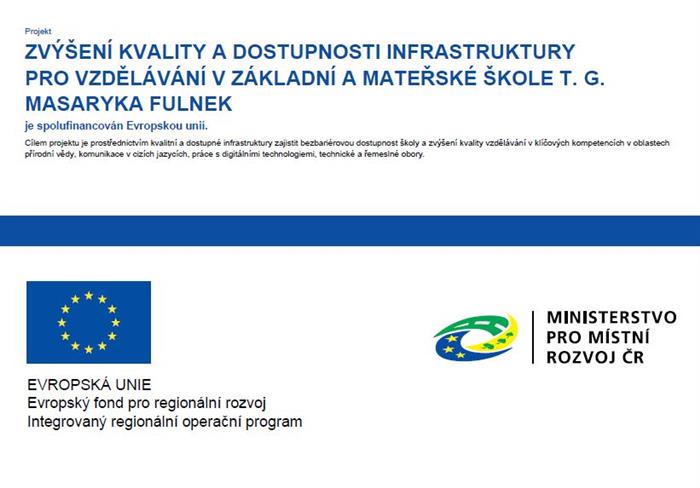 Základní škola T. G. Masaryka Fulnek p. o. podala v měsíci únoru 2017 žádost o podporu projektu s názvem Zvýšení kvality a dostupnosti infrastruktury pro vzdělávání v Základní škole T. G. Masaryka Fulnek, v rámci 47. výzvy IROP- Infrastruktura základních škol.